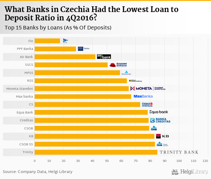 Based on a comparison of 20 banks in Czechia in 4Q2016, Fio banka operated with the lowest loan to deposit ratio, followed by PPF Banka and Air Bank.