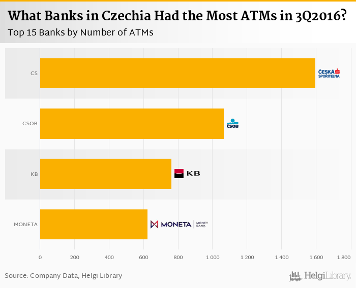 Based on a comparison of 5 banks in Czechia in 3Q2016, Ceska Sporitelna operated the largest ATM network, followed by CSOB and Komercni Banka.
