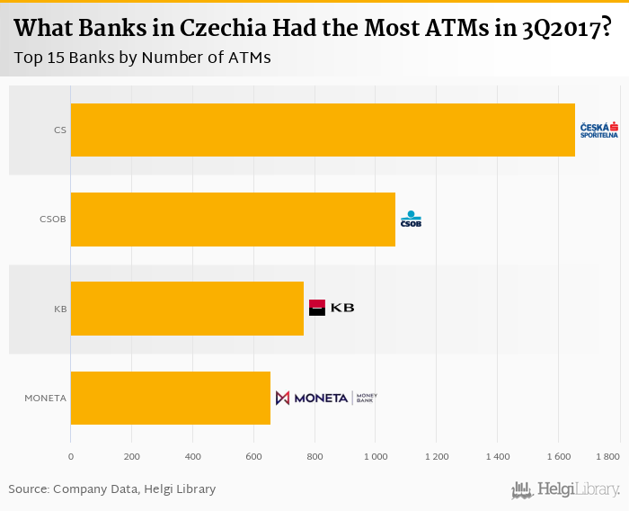 Based on a comparison of 5 banks in Czechia in 3Q2017, Ceska Sporitelna operated the largest ATM network, followed by CSOB and Komercni Banka.