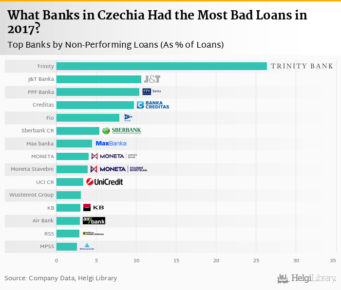 Based on a comparison of 23 banks in Czechia in 2017, Trinity Bank had the highest share of bad loans, followed by J&T Banka and PPF Banka.