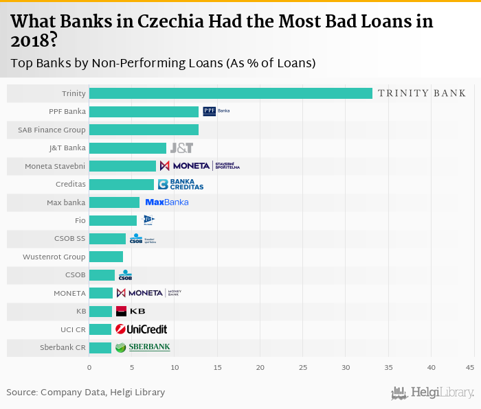 Based on a comparison of 24 banks in Czechia in 2018, Trinity Bank had the highest share of bad loans, followed by PPF Banka and SAB Finance Group.