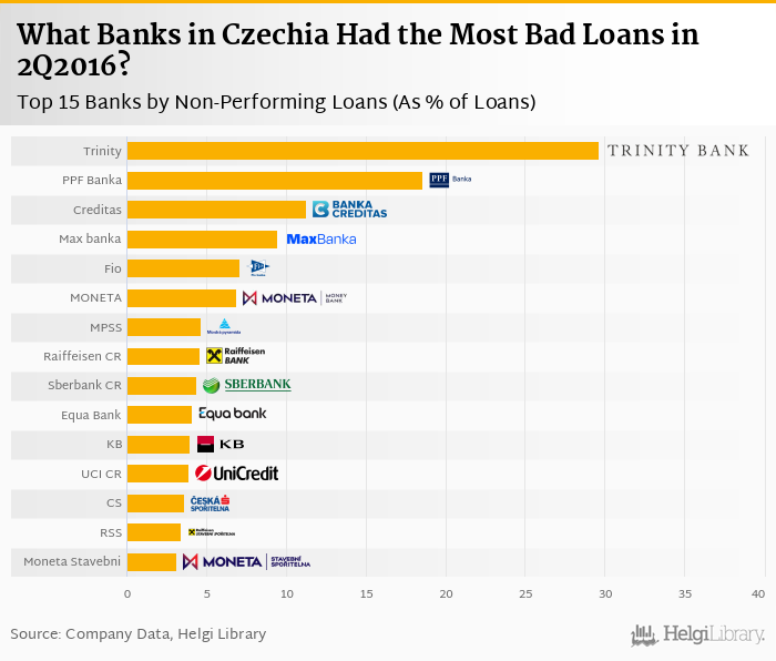 Based on a comparison of 21 banks in Czechia in 2Q2016, Trinity Bank had the highest share of bad loans, followed by PPF Banka and Banka Creditas.