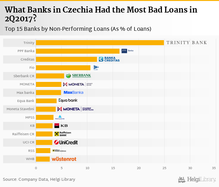 Based on a comparison of 21 banks in Czechia in 2Q2017, Trinity Bank had the highest share of bad loans, followed by PPF Banka and Banka Creditas.