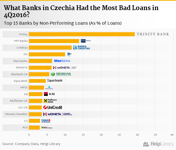 Based on a comparison of 21 banks in Czechia in 4Q2016, Trinity Bank had the highest share of bad loans, followed by PPF Banka and Banka Creditas.
