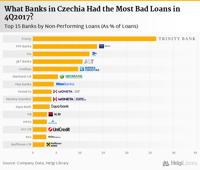 Based on a comparison of 22 banks in Czechia in 4Q2017, Trinity Bank had the highest share of bad loans, followed by PPF Banka and Fio banka.