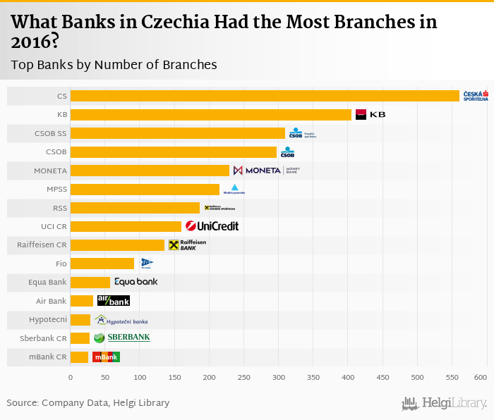 Comparing Ceska Sporitelna with its closest peers, Komercni Banka operated a network of 406 branches in 2016, CSOB Stavebni Sporitelna had 310 branches and CSOB had a network of 298 branches in 2016.