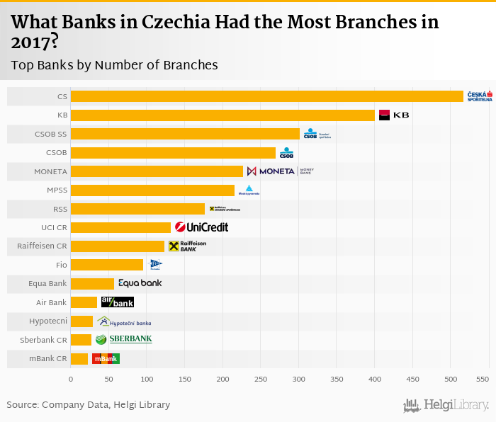 Comparing Ceska Sporitelna with its closest peers, Komercni Banka operated a network of 401 branches in 2017, CSOB Stavebni Sporitelna had 302 branches and CSOB had a network of 270 branches in 2017.
