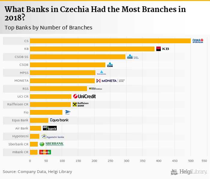 Comparing Ceska Sporitelna with its closest peers, Komercni Banka operated a network of 388 branches in 2018, CSOB Stavebni Sporitelna had 297 branches and CSOB had a network of 235 branches in 2018.
