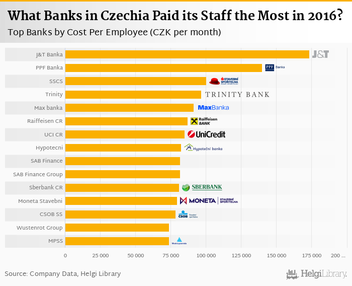 Based on a comparison of 26 banks in Czechia in 2016, J&T Banka was paying its employees the best, followed by PPF Banka and Stavebni Sporitelna Ceske Sporitelny.