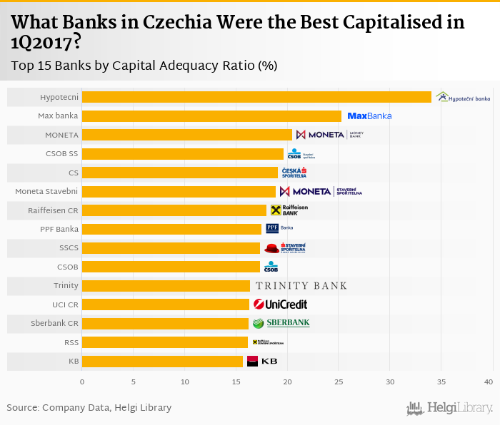 Based on a comparison of 21 banks in Czechia in 1Q2017, Hypotecni Banka was the best capitalised bank, followed by Max banka and MONETA Money Bank.