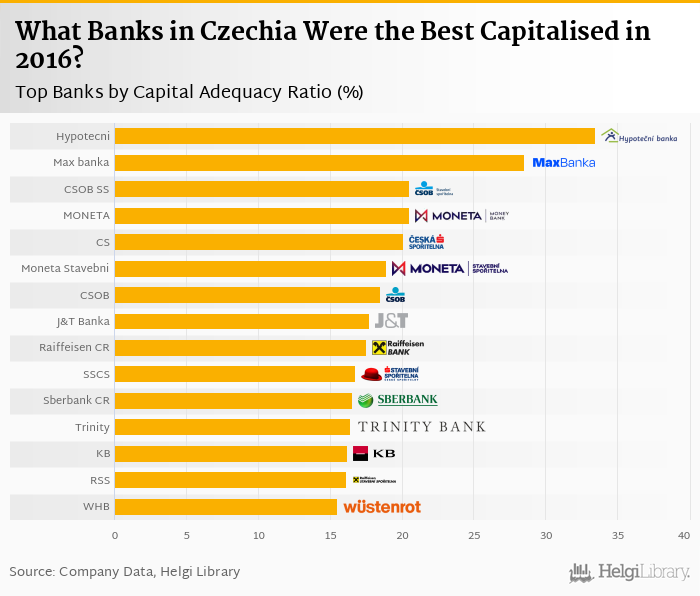 Based on a comparison of 23 banks in Czechia in 2016, Hypotecni Banka was the best capitalised bank, followed by Max banka and CSOB Stavebni Sporitelna.