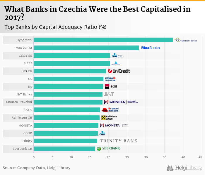 Based on a comparison of 23 banks in Czechia in 2017, Hypotecni Banka was the best capitalised bank, followed by Max banka and CSOB Stavebni Sporitelna.