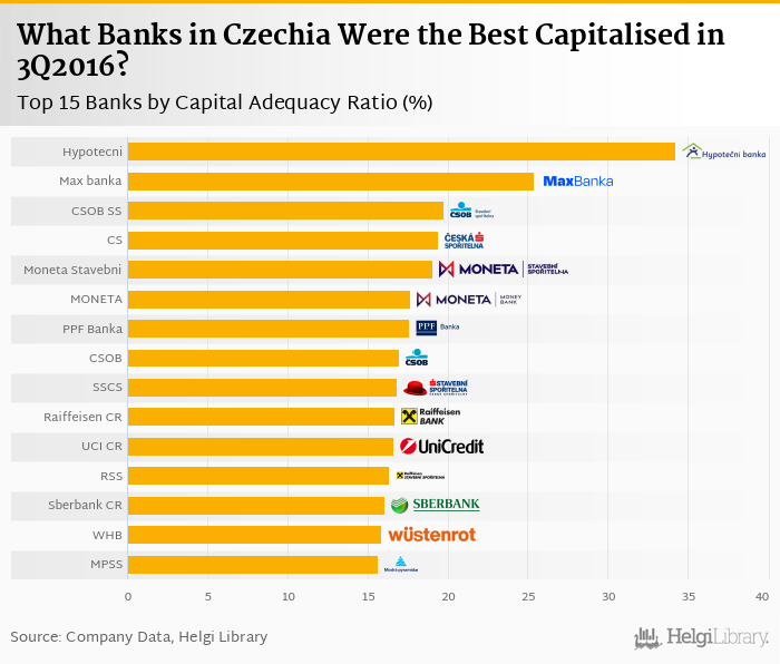 Based on a comparison of 21 banks in Czechia in 3Q2016, Hypotecni Banka was the best capitalised bank, followed by Max banka and CSOB Stavebni Sporitelna.