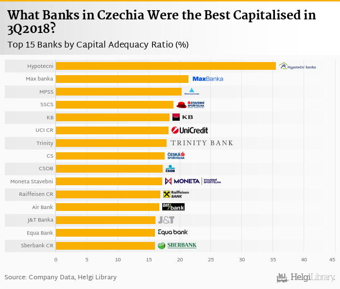 Based on a comparison of 22 banks in Czechia in 3Q2018, Hypotecni Banka was the best capitalised bank, followed by Max banka and Modra Pyramida Stavebni Sporitelna.
