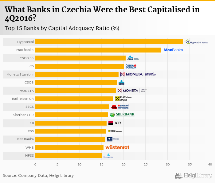 Based on a comparison of 21 banks in Czechia in 4Q2016, Hypotecni Banka was the best capitalised bank, followed by Max banka and CSOB Stavebni Sporitelna.