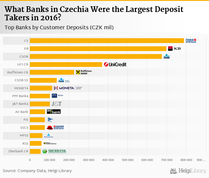 Based on a comparison of 27 banks in Czechia in 2016, Ceska Sporitelna was the largest deposit taker, followed by Komercni Banka and CSOB.