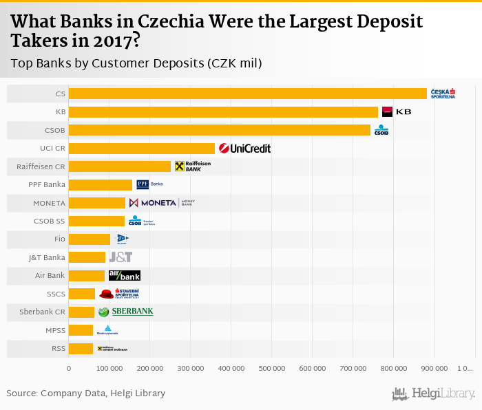 Based on a comparison of 27 banks in Czechia in 2017, Ceska Sporitelna was the largest deposit taker, followed by Komercni Banka and CSOB.