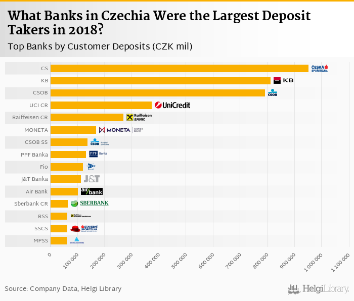 Based on a comparison of 27 banks in Czechia in 2018, Ceska Sporitelna was the largest deposit taker, followed by Komercni Banka and CSOB.