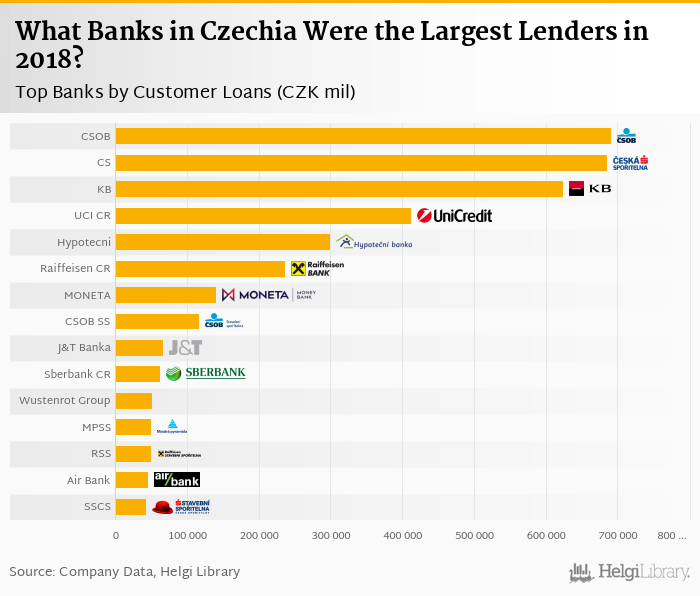 Based on a comparison of 27 banks in Czechia in 2018, CSOB was the largest lender, followed by Ceska Sporitelna and Komercni Banka.