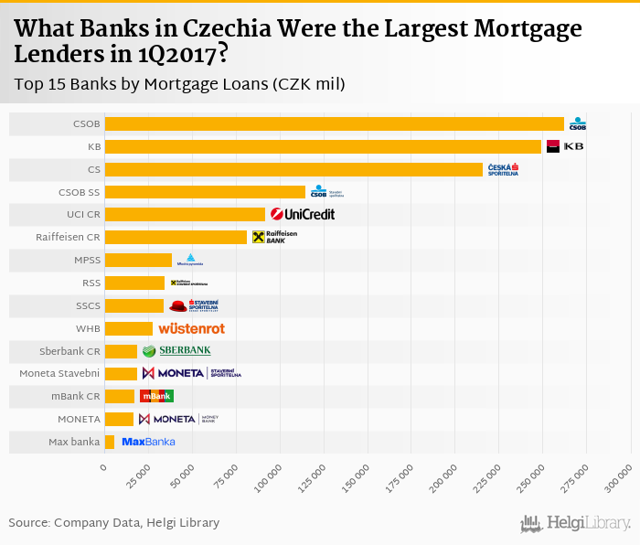 Based on a comparison of 15 banks in Czechia in 1Q2017, CSOB was the largest mortgage lender, followed by Komercni Banka and Ceska Sporitelna.