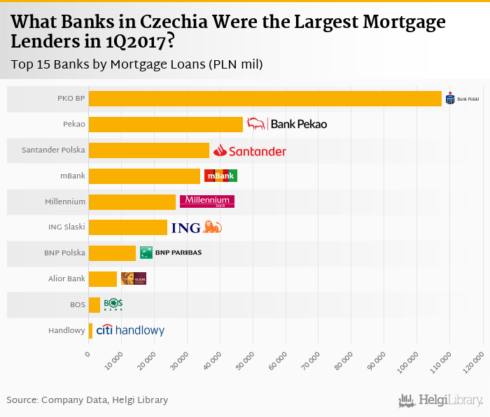 Based on a comparison of 11 banks in Poland in 1Q2017, PKO BP was the largest mortgage lender, followed by Pekao and Santander Bank Polska.