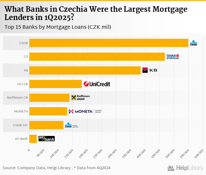 Based on a comparison of 17 banks in Czechia in 1Q2025, CSOB was the largest mortgage lender, followed by Ceska Sporitelna and Komercni Banka.