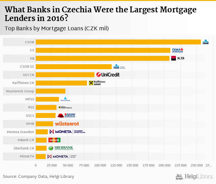 Based on a comparison of 18 banks in Czechia in 2016, CSOB was the largest mortgage lender, followed by Ceska Sporitelna and Komercni Banka.