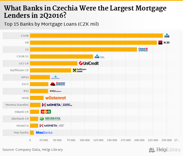 Based on a comparison of 15 banks in Czechia in 2Q2016, CSOB was the largest mortgage lender, followed by Komercni Banka and Ceska Sporitelna.