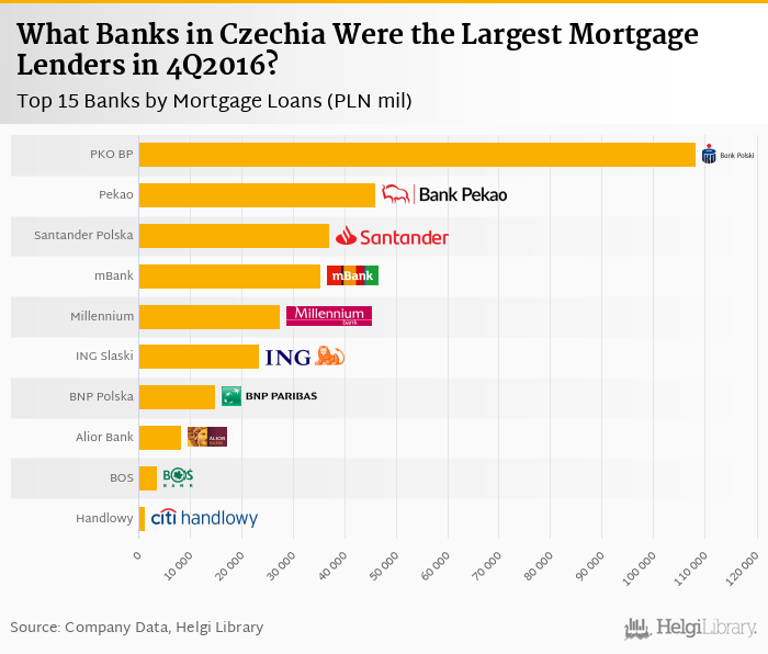 Based on a comparison of 11 banks in Poland in 4Q2016, PKO BP was the largest mortgage lender, followed by Pekao and Santander Bank Polska.