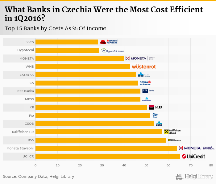 Based on a comparison of 21 banks in Czechia in 1Q2016, Stavebni Sporitelna Ceske Sporitelny was the most cost efficient bank, followed by Hypotecni Banka and MONETA Money Bank.