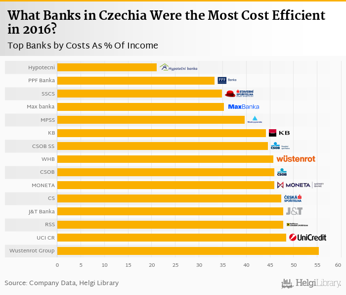 Based on a comparison of 26 banks in Czechia in 2016, Hypotecni Banka was the most cost efficient bank, followed by PPF Banka and Stavebni Sporitelna Ceske Sporitelny.