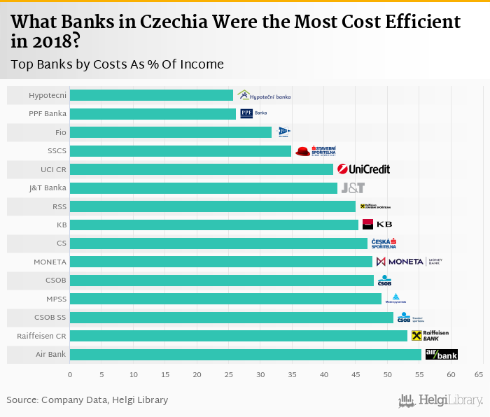 Based on a comparison of 26 banks in Czechia in 2018, Hypotecni Banka was the most cost efficient bank, followed by PPF Banka and Fio banka.