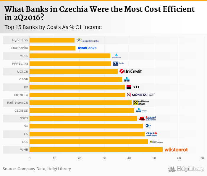 Based on a comparison of 21 banks in Czechia in 2Q2016, Hypotecni Banka was the most cost efficient bank, followed by Max banka and Modra Pyramida Stavebni Sporitelna.