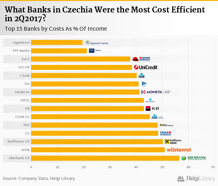 Based on a comparison of 21 banks in Czechia in 2Q2017, Hypotecni Banka was the most cost efficient bank, followed by PPF Banka and Stavebni Sporitelna Ceske Sporitelny.