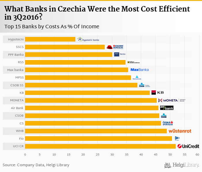 Based on a comparison of 21 banks in Czechia in 3Q2016, Hypotecni Banka was the most cost efficient bank, followed by Stavebni Sporitelna Ceske Sporitelny and PPF Banka.