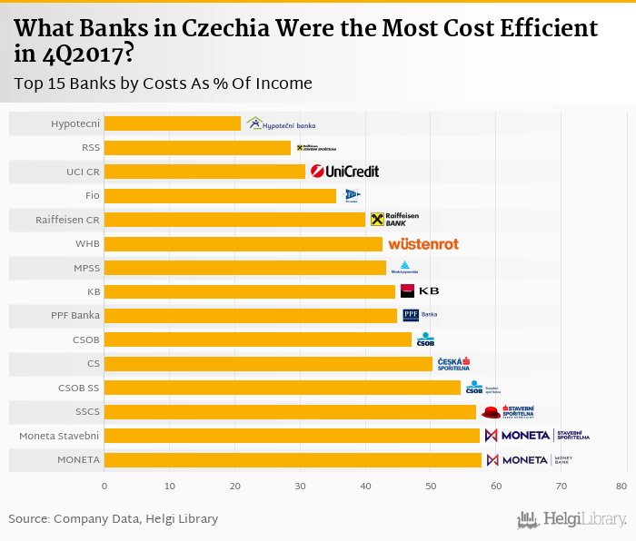 Based on a comparison of 21 banks in Czechia in 4Q2017, Hypotecni Banka was the most cost efficient bank, followed by Raiffeisen Stavebni Sporitelna and UniCredit Bank Czecho-Slovakia.