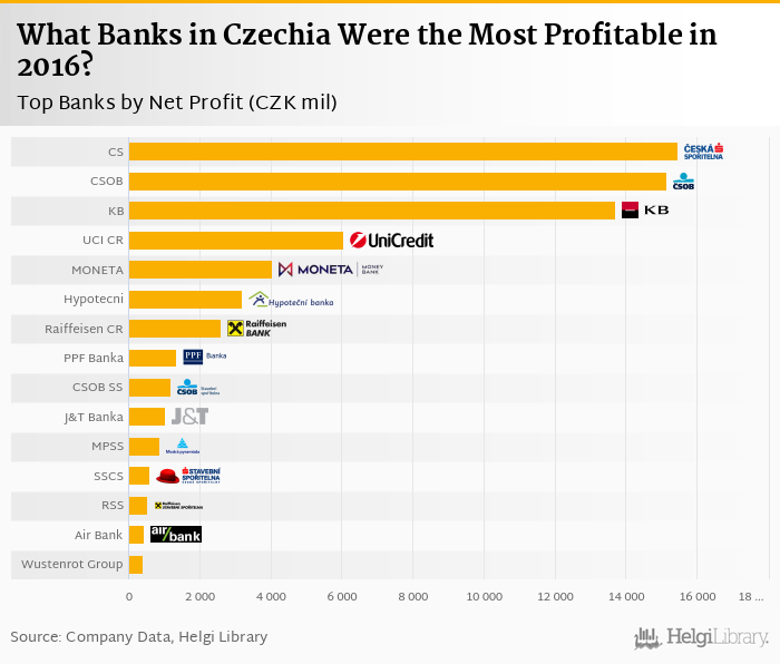 Based on a comparison of 26 banks in Czechia, Ceska Sporitelna produced the highest net profit in 2016, followed by CSOB and Komercni Banka.