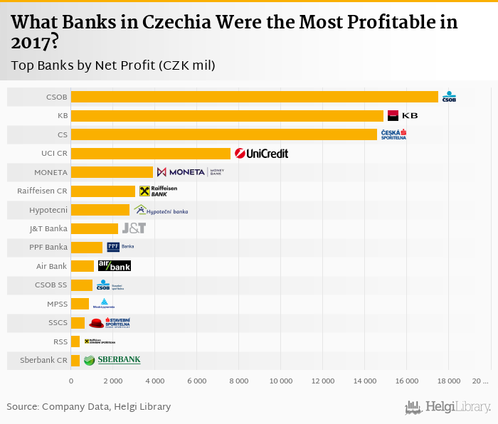 Based on a comparison of 26 banks in Czechia, CSOB produced the highest net profit in 2017, followed by Komercni Banka and Ceska Sporitelna.