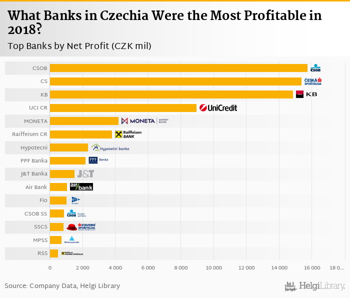Based on a comparison of 26 banks in Czechia, CSOB produced the highest net profit in 2018, followed by Ceska Sporitelna and Komercni Banka.