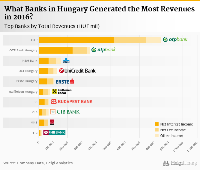 Based on a comparison of 10 banks in Hungary in 2016, OTP Group generated the largest revenues, followed by OTP Bank Hungary and K&H Bank.