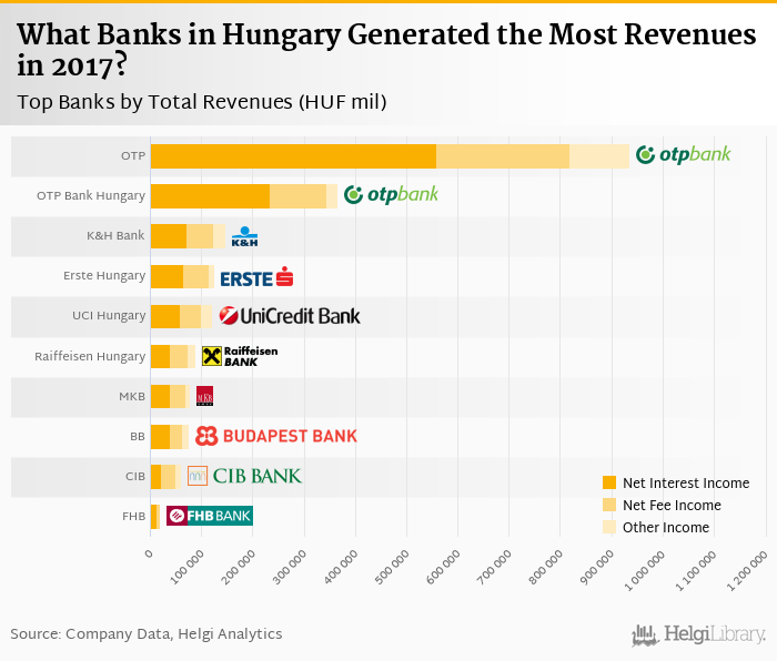 Based on a comparison of 10 banks in Hungary in 2017, OTP Group generated the largest revenues, followed by OTP Bank Hungary and K&H Bank.
