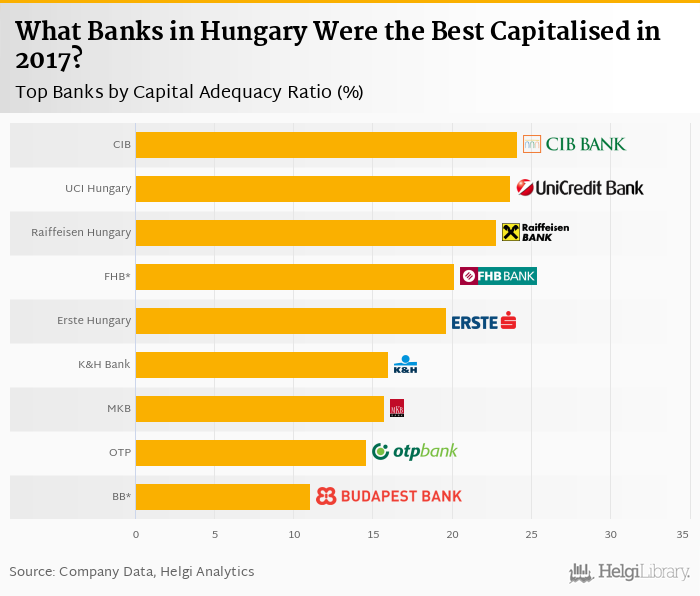 Based on a comparison of 9 banks in Hungary in 2017, CIB Bank was the best capitalised bank, followed by UniCredit Bank Hungary and Raiffeisen Bank Hungary.