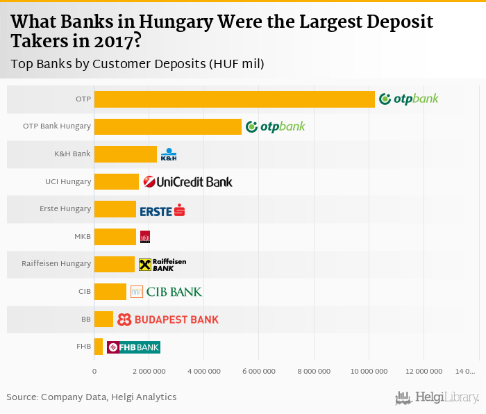 Based on a comparison of 10 banks in Hungary in 2017, OTP Group was the largest deposit taker, followed by OTP Bank Hungary and K&H Bank.