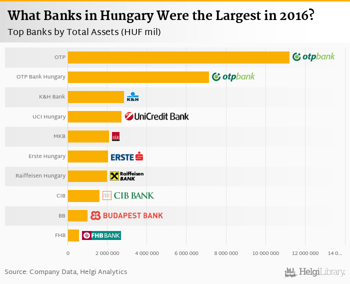 Based on a comparison of 10 banks in Hungary in 2016, OTP Group was the largest bank by assets, followed by OTP Bank Hungary and K&H Bank.