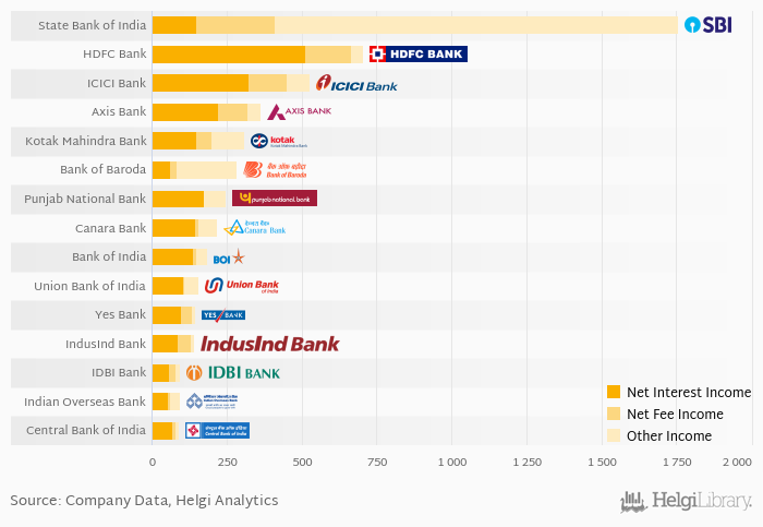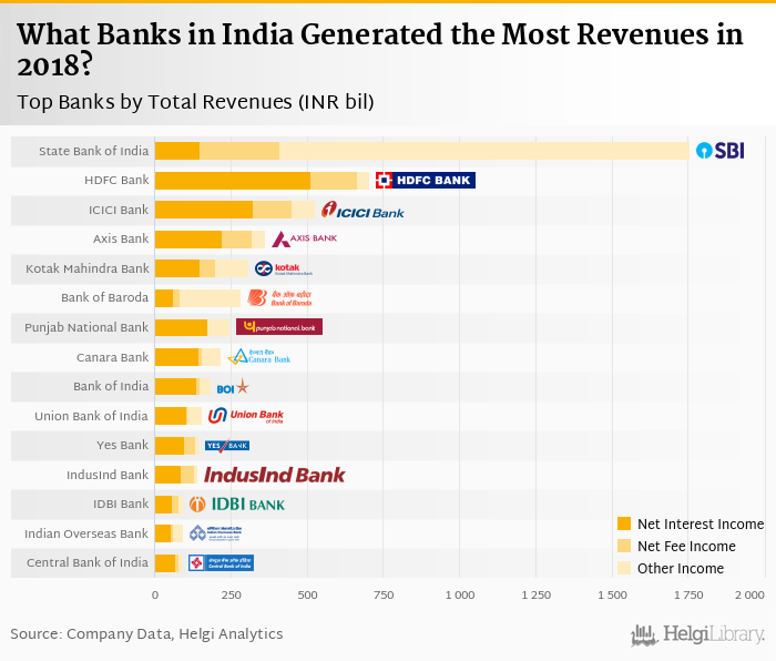 Based on a comparison of 26 banks in India in 2018, State Bank of India generated the largest revenues, followed by HDFC Bank and ICICI Bank.