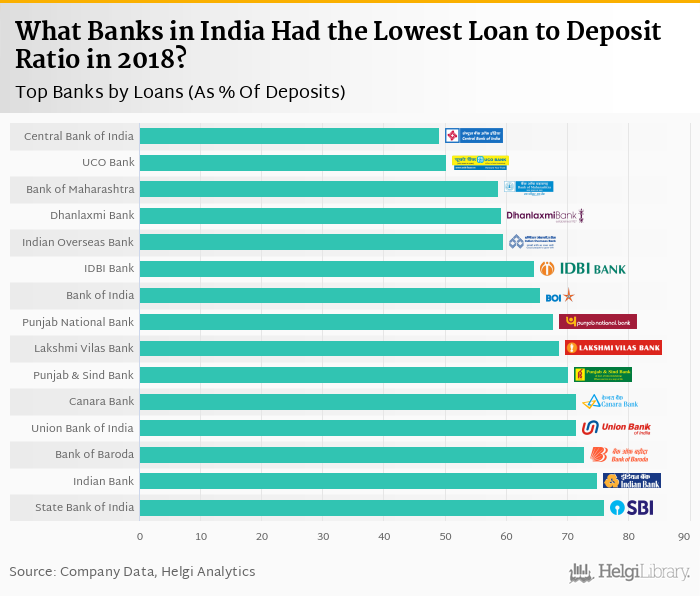 Based on a comparison of 26 banks in India in 2018, Central Bank of India operated with the lowest loan to deposit ratio, followed by UCO Bank and Bank of Maharashtra.