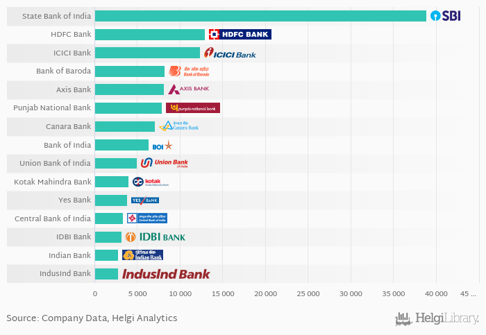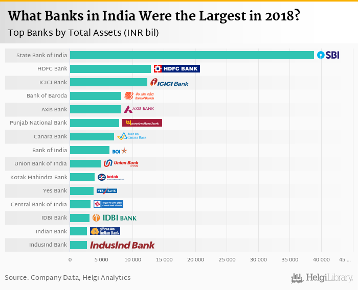 Based on a comparison of 26 banks in India in 2018, State Bank of India was the largest bank by assets, followed by HDFC Bank and ICICI Bank.