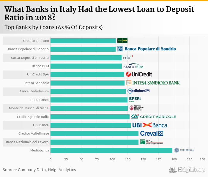 Based on a comparison of 14 banks in Italy in 2018, Credito Emiliano operated with the lowest loan to deposit ratio, followed by Banca Popolare di Sondrio and Cassa Depositi e Prestiti.