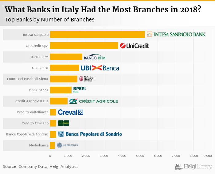 Comparing Intesa Sanpaolo with its closest peers, UniCredit SpA operated a network of 3,815 branches in 2018, Banco BPM had 1,804 branches and UBI Banca had a network of 1,648 branches in 2018.