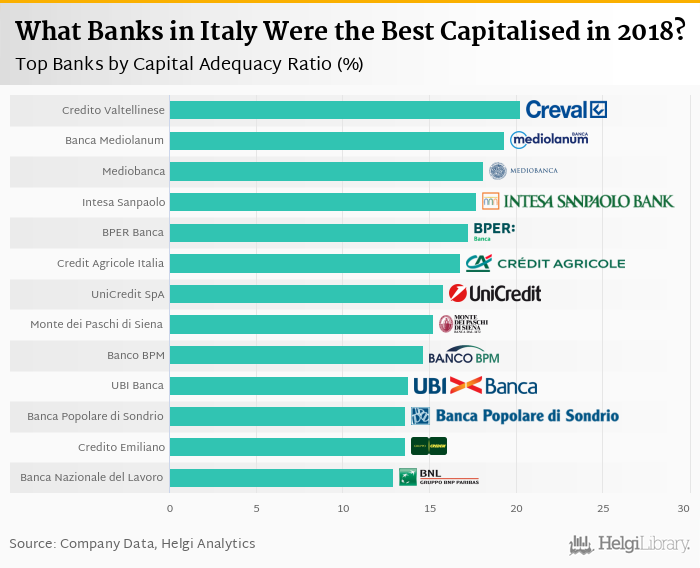 Based on a comparison of 13 banks in Italy in 2018, Credito Valtellinese was the best capitalised bank, followed by Banca Mediolanum and Mediobanca.